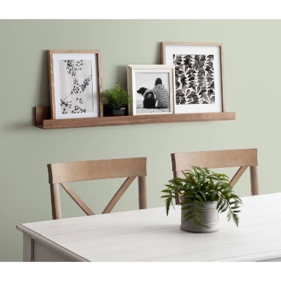Display your picture frames or framed art in modern style with this floating shelf wall ledge. Designed to be the perfect size to fit in your home, this shelf is 42 inches long, 3.25 inches deep, and has a 1.75 inch front lip. It has an inner area depth of 2.5 inches to allow you to layer your picture frames to create a gorgeous modern wall statement. This wall shelf ships fully assembled so it is ready for wall display two pre-drilled holes to use for hanging. This floating ledge is crafted of quality wood for lasting durability. Use this photo rail in the living room, bedroom, or any room of the home to display your photo memories or art in contemporary design.