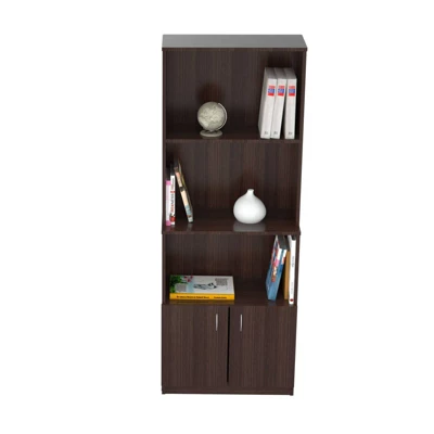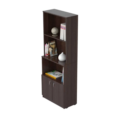 Bookcase by Inval finished in a rich “Espresso” laminates in durable melamine which is stain, heat and scratch resistant. Constructed from manufactured wood. The unit has a functional modern design that is an excellent choice for your home office or office. The bookcase features three shelves, one being adjustable to accommodate books and accessories, as well as a concealed storage compartment that has two doors with brushed metal handles.