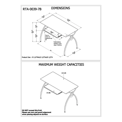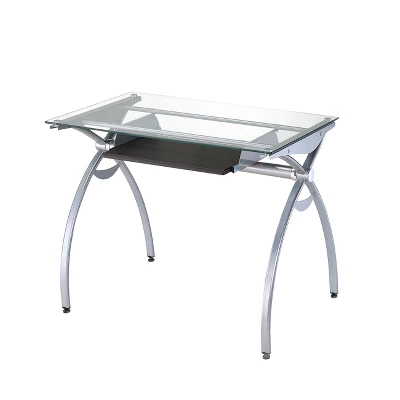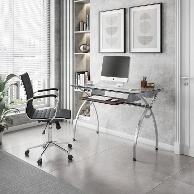The contempo style of this Techni Mobili Glass-Top Computer Desk brings a crisp and smart ambiance to any office. It features a heavy-duty 8 mm tempered safety glass desktop, the stylish lines of a curved scratch-resistant powder-coated steel frame, and a pull-out keyboard panel with moisture resistant PVC laminate veneer in a Mahogany finish. With its compact footprint you can furnish your workspace with style and efficiency. The desktop has a 110 lbs. weight capacity and the keyboard shelf has a 33 lbs. weight capacity. It is ready and easy to assemble. Color: Clear Glass & Mahogany Keyboard