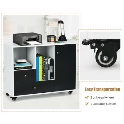 Fill your home with modern appeals with our multi-storage rolling filling cabinet! Considerable storage and display spaces have been offered to you with 2 open shelves, 2 concealed adjustable cubbies, 2 drawers, and a wide cabinet top. 4 steel casters make this lateral filling cabinet more convenient to rearrange locations while adding more stability with braking systems. With a bulky load-bearing of 188 lbs in total, this portable printer stand is suitable as an office filing organizer, a kitchen rolling buffet, a storage sideboard, and so on. In addition, this high-quality cabinet requires manual assembly and minimal maintenance.