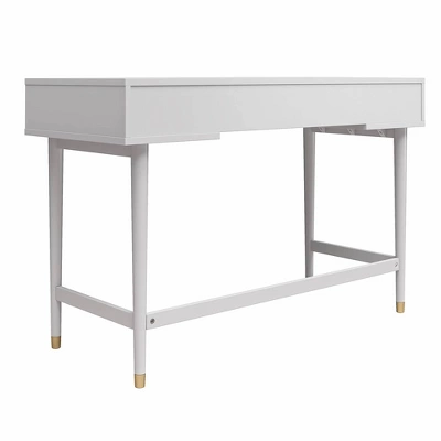 CosmoLiving by Cosmopolitan brings you a truly Pinterest-worthy bedroom ensemble with the lavish, lux Elizabeth Collection. The contemporary chic design of the Elizabeth Desk melds perfectly with midcentury modern contours to create an instant focal point in any room. Fabulously designed with 2 ribbed, textured drawer fronts and adorned with glam gold drawer pulls. The 2 roomy drawers, painted in a creamy dove gray finish, are perfect for tucking away sparkly gel pens, reading materials, or a journal to achieve an organized workspace. Constructed from durable painted MDF, the Elizabeth Desk beautifully sits atop tapered solid wood legs, nestled in gold capped feet, creating a sophisticated and polished look, fit for a modern-day queen like yourself.
