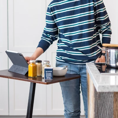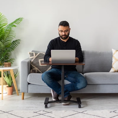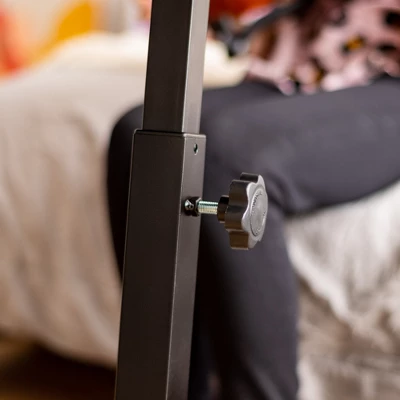 This IRIS USA Laptop table is moisture resistant PVC laminate veneer table and adjustable height. The table supports up to 74 pounds to create a strong and sturdy temporary home working station in an instant. With the two lockable wheels with table legs when standing of the legs the stand will not get in the way.