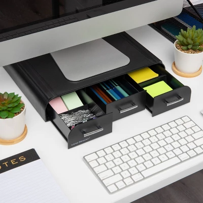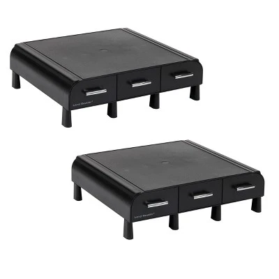Instantly improve your work experience with DURABLE & LIGHTWEIGHT monitor stands with storage drawers. Use with most flat screen display monitors or televisions, laptops, printers and more – they are stylish and neutral in design so they will coordinate with any at work or home office décor. A great wey to reduce STRESS, NECK AND BACK PAIN – Raise computer monitors, laptops and tv displays to a comfortable viewing position for more optimal work conditions while improving neck position – helps to reduce back pain caused by poor posture while working or watching tv. ANTI SLIP CONSTRUCTION keeps units still while you work. EXTRA STORAGE IS A PLUS – additional organizational space is always a benefit, even if it’s just to hold your pencils, pens and post-its. Looking for a place for your keyboard or papers, slide them underneath the riser drawer to create additional organization for yourself. PERFECT FOR HOME AND OFFICE USE: Enjoy improved performance and work efficiencies with these monitor or tv stands while you work or watch tv – LED, LCD, OLED Flat Screen Displays, iMac, desktop PC and more PLUS Storage. SPACE SAVING UNIT WITH DRAWER: Computer and monitor risers create additional storage on your desk, table or home entertainment furniture by raising your device off of the surface – store magazines, pencils, paper and more in the built-in drawer. ORGANIZATIONAL AND STORAGE: Improve overall organization on your desk or home office – add more desk surface by lifting your monitor up onto a desktop or tabletop stand – store pens, pencils and office supplies inside. REDUCE EYE STRAIN: Creating an optimal work or entertainment viewing experience is critical for eye, neck and back strain – sitting at the recommended distance from your device will help to reduce pain due to poor posture. STUDENT MUST HAVE: The perfect addition to any dorm room – create a comfortable and safe study environment for hours of studying on computer or tablet device or for TV viewing with friends. Monitor or computer risers are always EASY TO CARE FOR AND CLEAN. Clean your monitor stand riser with damp cloth for long lasting use and storage as needed. These monitor or tv screen stands make great gifts for the holidays, people who work at home or students going off to college. Perfect for all ages and both guys and gals, computer stands or risers can be used in any room in your home. Lift things off the counter in the kitchen to create more space and organize your recipes inside and place tv or iPad for easy viewing while cooking on top. Perfect for the bedroom to raise your tv to the right viewing height. They make a great back to college gift for students or first time students going off to school.