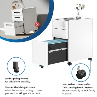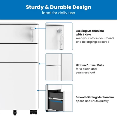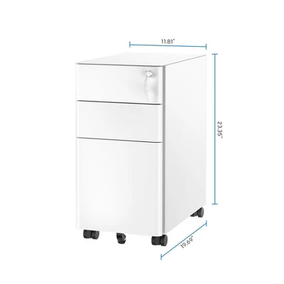 Organize your office supplies and folders in style, with this 3-drawer file cabinet featuring a slim and contemporary design that enhances any office space. With a large storage capacity, the bottom drawer accommodates letter, legal, and A4 size folders, providing you with plenty of room to organize and store your important files. It extends fully allowing you easy access to your folders. The top drawer of the file cabinet includes an adjustable pencil tray, allowing you to keep your writing utensils neatly organized and easily accessible. No more searching for pens or pencils! All drawers open and close smoothly and quietly and the hidden drawer pulls give the cabinet a seamless and clean look. Our file cabinet is designed to save space, making it an ideal choice for both corporate and home office environments. Its compact size allows it to fit seamlessly into any office layout. Crafted from high-quality steel, our file pedestal is built to withstand the demands of daily use. It features a sturdy and durable design and is equipped with 360 swivel wheels for easy mobility and accessibility. Keep your belongings safe and secure thanks to the built-in lock. You can have peace of mind knowing that your confidential documents and valuable items are protected. For added safety and accident prevention, only one drawer can be opened at a time and the additional front wheel prevents the unit from tipping.