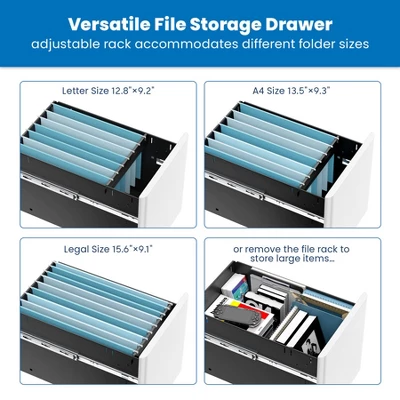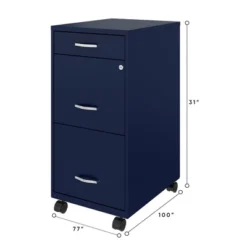 - Three drawers provide ample storage capacity for letter, legal, and A4 size folders as well as other office supplies