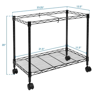 Our mobile file cart is the ideal filing management tool for your office. Hang your file folders to get organized and save space. It features four swiveling wheels to easily move between workspaces, or to slide in and out of your under desk area. It accommodates letter and legal size hanging folders. It’s ideal for personal workspaces, home offices, conference rooms, libraries or anywhere else storage and filing is needed.Lower shelf offers additional storage space for office supplies or other items. Made from high-strength metal wire for durability and high load capacity. Each shelf can carry up to 150 lbs of load. Sleek design and black powder coated finish suits any office space and protects your mobile filing cart from chipping and damage.