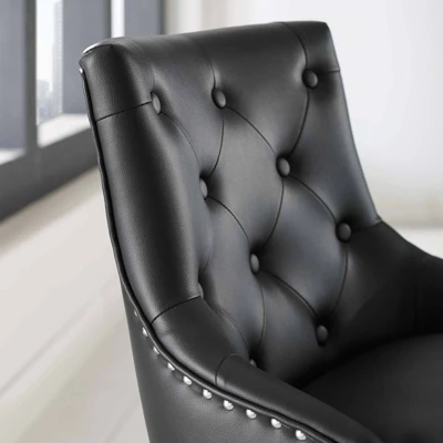 Introduce vintage flair and elegant appeal with the Regent Button Tufted Upholstered Vegan Leather Swivel Office Chair. Metal nailhead trim and tufted buttons provide visual depth, while a luxuriously padded Vegan Leather back and seat for exceptional support to this superbly constructed computer desk chair. A polished chrome base and five dual-wheel nylon casters provide easy movement over hardwood or carpeted surfaces while a full 360-degree swivel and pneumatic height adjustment create a custom seating experience for optimal performance. Perfect for the modern home or office, this Vegan Leather office chair is a desirable addition to any workspace. Chair Weight Capacity: 287 lbs.