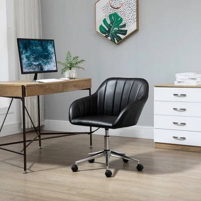 Add class and comfort to your home office with this computer desk chair from Vinsetto. This armchair has a chic tub design with line faux leather stitching on the backrest to create a luxury atmosphere. The mid-back backrest and curved armrests offer back and shoulder support to feel more relaxed. Adjust the seat height of this PC chair to accommodate your desk and sitting style. Get around your office quickly with 360 degree swivel wheels. Relax in style and comfort with this tub office armchair from Vinsetto