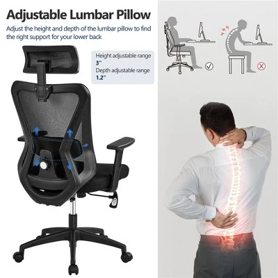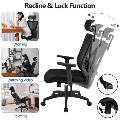 - If you spend a lot of time at your desk, you’ll need such a comfortable and functional office chair. High mesh back supports your entire back, neck and head, at the same time, bringing a cool sitting experience. A large, cushioned seat relieves fatigue from prolonged sitting. Best of all, our desk chair is highly adaptable to meet your preferences. The seat height, lumbar support, headrest, armrests, and back tilt angle can all be adjusted for ultimate comfort. The star base with five nylon castors allows 360ยฐ smooth and mute mobility. Make your day productive but relaxing from now on.